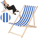 Leżak plażowy składany, drewniany z biało-niebieskim materiałem