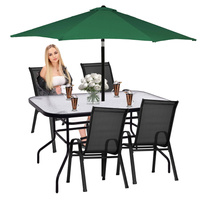Zestaw ogrodowy marki Springos, składający się ze stołu i 4 krzeseł pomoże ci odpowiednio wyposażyć ogród i taras. Połączenie hartowanego szkła z minimalistycznym wyglądem sprawia, że komplet będzie wyglądał świetnie jako element istniejącej już aranżacji. To właśnie dzięki niemu będziesz mogła wygodnie spędzać czas na świeżym powietrzu z najbliższymi. Blat stołu posiada zaokrąglone ranty, aby zwiększyć bezpieczeństwo w trakcie użytkowania. Dodatkowo na środku blatu znajduje się otwór, który pozwala na montaż w jego wnętrzu parasola. Dzięki temu rodzina i znajomi ukryją się przed mocnym słońcem w cieniu parasola.